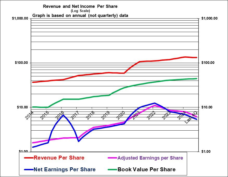 | MOST RECENT EARNINGS AND SALES TREND: The recent earnings growth trend has been quite weak. The revenue per share growth in the past four quarters was minus 7%, minus 8%, 5%, and 5%. The earnings per share growth in the last four quarters was minus 25%, minus 22%, minus 39% and minus 31%. The adjusted earnings per share DECLINE in 2024 was 7%, while revenues per share were up 14% (driven by a large acquisition). The adjusted earnings per share DECLINE in 2023 was 23%, while revenues per share were up 7%. The adjusted earnings per share gain in 2022 was 53% but revenue per share growth was just 6%. The adjusted earnings per share growth in 2021 was 59% and the revenue per share growth was 83%! | |