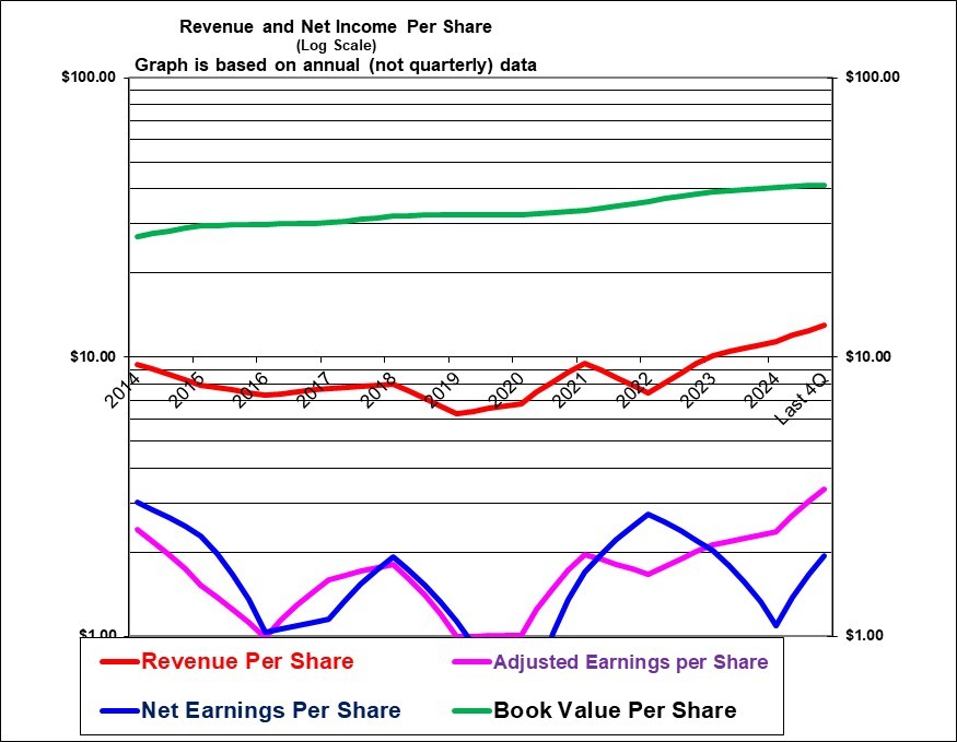 MOST RECENT EARNINGS AND SALES TREND:  This company has volatile and cyclic earnings and various accounting issues that make the adjusted earnings highly variable. Revenues per share in the past seven quarters starting with the most recent (Q3 2025) were up 23%, up 46%, up 3%, up 38%, down 32%, up 9%, and up 41%. In the same four quarters, adjusted earnings per share were (too volatile to bother listing). In 2024 overall, revenues per share were up 12% and adjusted earnings per share were up 11%. In 2023 overall, revenues per share were up 37% and adjusted earnings per share were up 28%. In 2022 revenues per share were down 22% and adjusted earnings per share were down 15%. In 2021, revenues per share and adjusted earnings were up substantially but that is in comparison to a very weak 2020. The graph shows a negative trend in revenues and earnings per share dating back to 2014 (when oil prices fell).